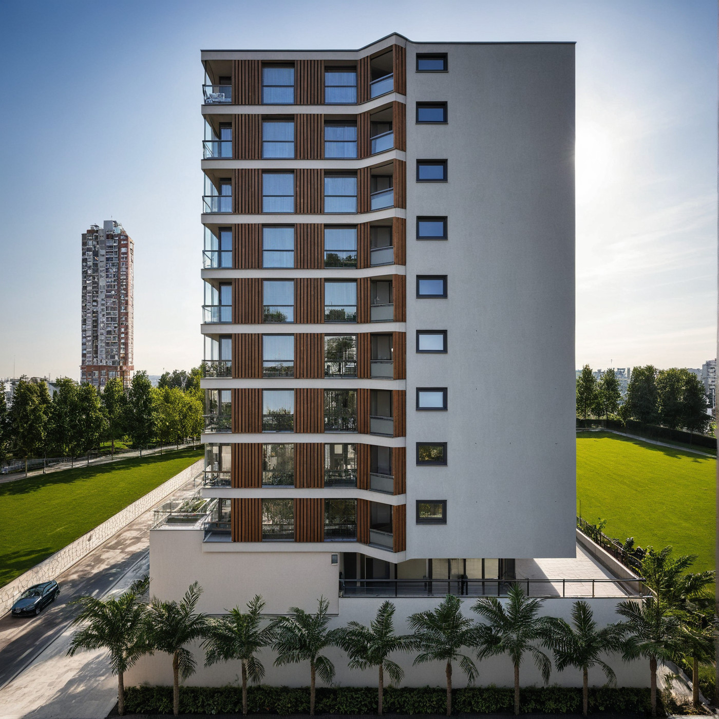 Les lignes architecturales se caractérisent par leur simplicité et leur pureté géométrique. Les brise-soleils intégrés aux façades ne se contentent pas d’ajouter une dimension visuelle à l’immeuble, mais apportent également une protection solaire essentielle, en réduisant l’apport de chaleur tout en préservant le confort thermique des logements.